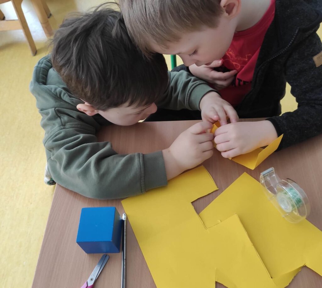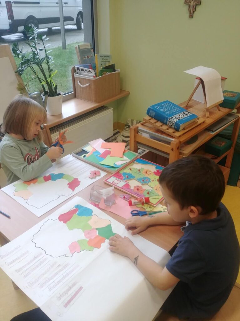 - Praca własna trwa 3 godziny dziennie; dzieci wybierają materiały, eksplorują we własnym tempie