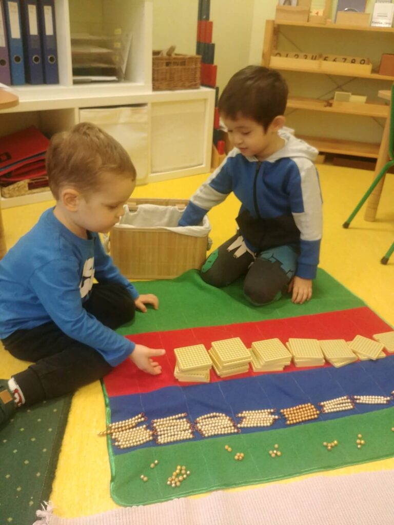 Pięciolatek pracujący z dodawaniem na złotych perłach to wzór dla młodszego dziecka: „Ja też tak chcę!” Obserwacja starszych kolegów działa silniej niż 1000 instrukcji dorosłego.